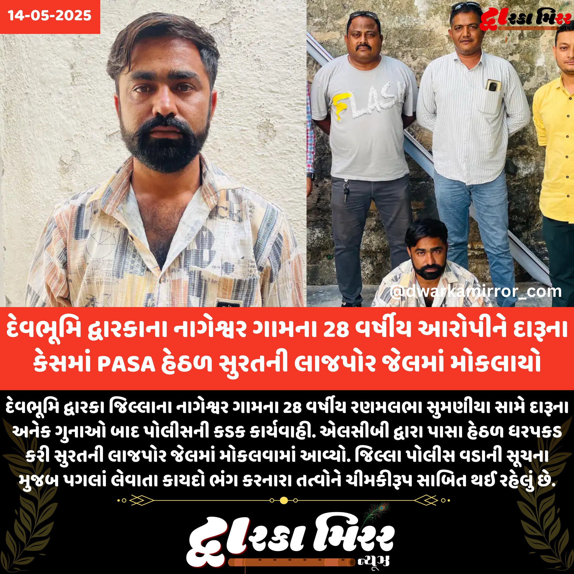 દેવભૂમિ દ્વારકા જિલ્લાના નાગેશ્વર ગામના 28 વર્ષીય રણમલભા સામરાભા સુમણીયાને ગુરૂવારે કાયદાકીય કાર્યવાહી હેઠળ પાસા (પ્રિવેન્ટિવ ડિટેન્શન એક્ટ) હેઠળ જેલ હવાલે કરવામાં આવ્યો છે.