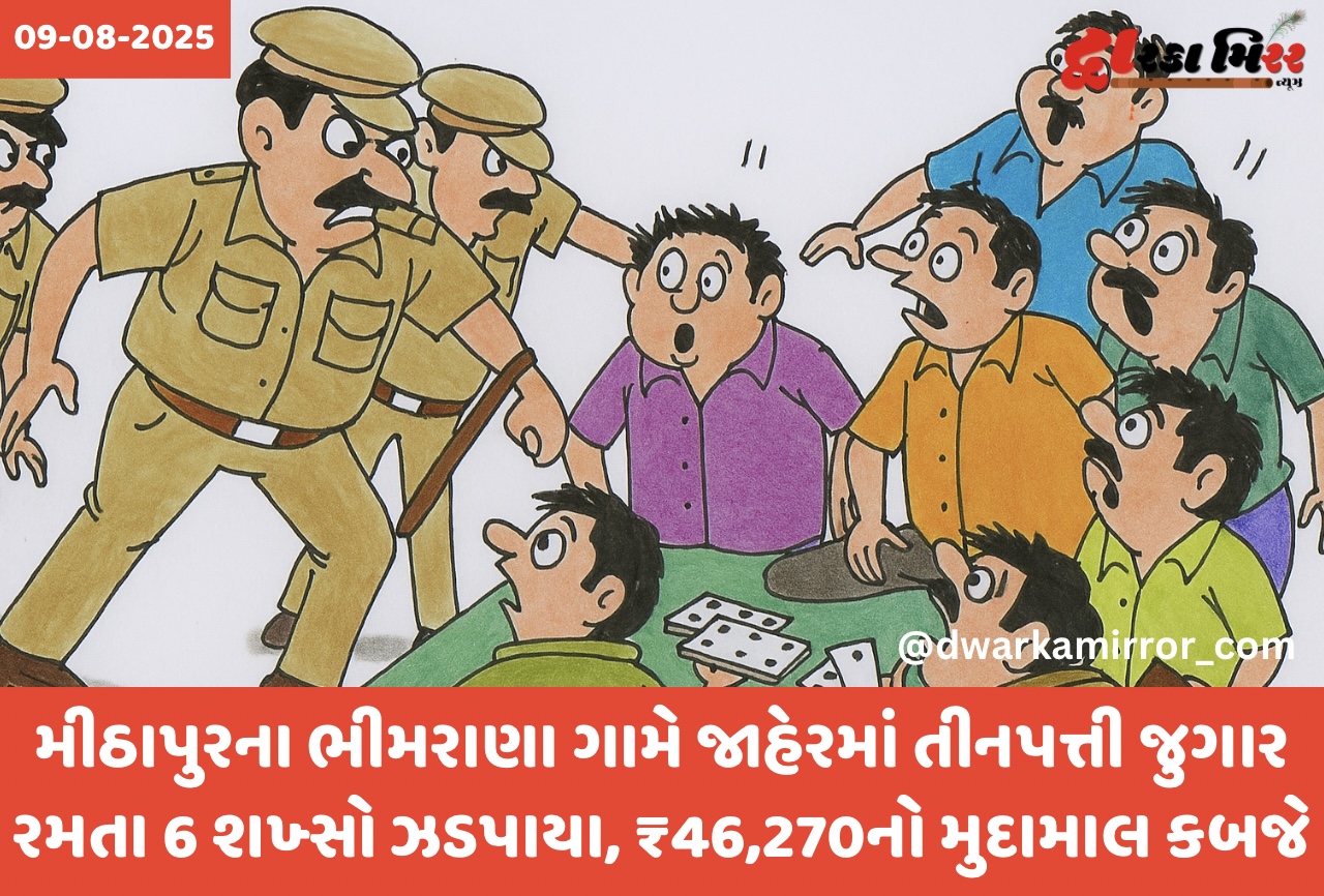દેવભૂમિ દ્વારકા જિલ્લામાં મીઠાપુર પોલીસ સ્ટેશન હદમાં તા. ૦૮/૦૮/૨૦૨૫ના રોજ સાંજે ૪:૩૦ કલાકે ભીમરાણા ગામે એસ્સાર પંપ સામે આવેલ બી.પી.એલ. ક્વાર્ટરમાં જાહેરમાં તીનપત્તી જુગાર રમાતા હોવાની બાતમી આધારે પોલીસે તાત્કાલિક રેઇડ કરી કાર્યવાહી હાથ ધરી હતી.