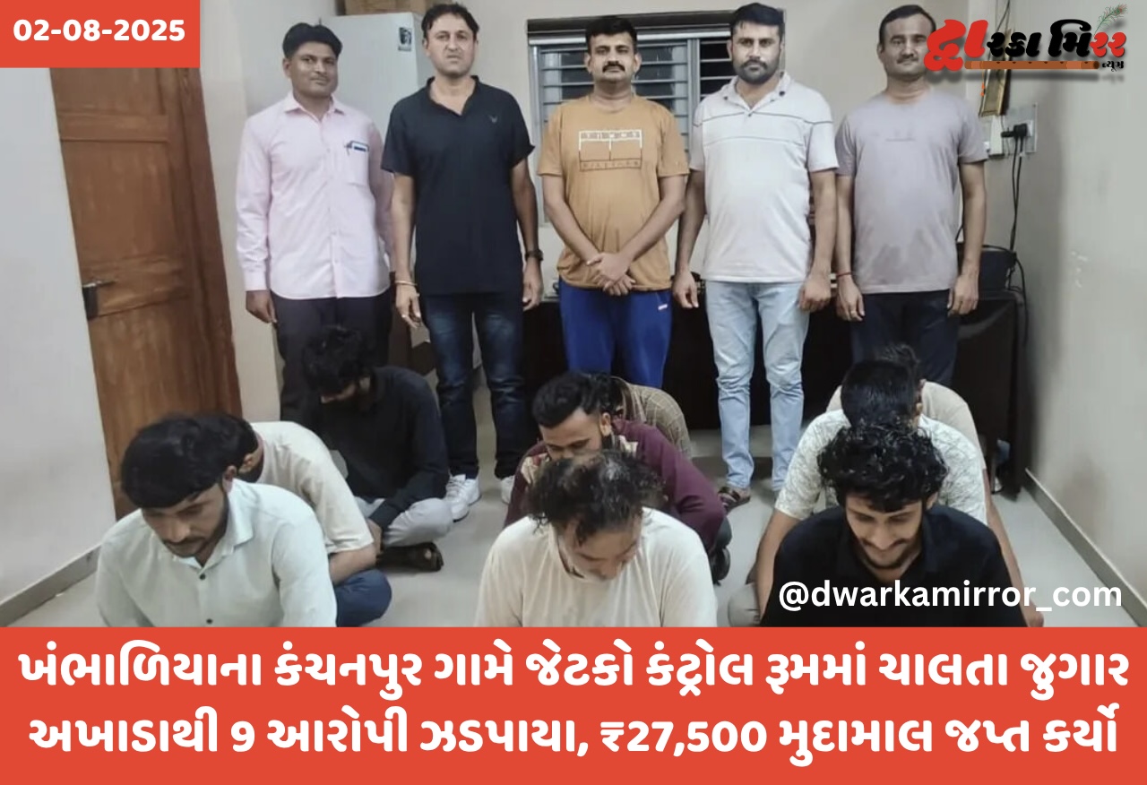 ખંભાળીયા પોલીસની અસરકારક કાર્યવાહી: કંચનપુર ગામની વાડીમાં જુગારના અખાડા પર રેડ, ૯ જુગારીઓ ઝડપાયા