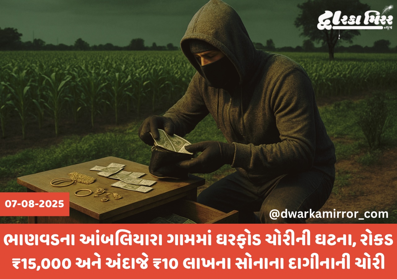 દેવભૂમિ દ્વારકા જિલ્લાના ભાણવડ તાલુકાના આંબલિયારા ગામના વાડી વિસ્તારમાં ઘરફોડ ચોરીની ગંભીર ઘટના સામે આવી છે. પ્રાપ્ત માહિતી મુજબ ગામના રહીશ અશોકભાઈ મગનભાઈ લીંબડના નિવાસસ્થાને અજાણ્યા શખ્સોએ ઘરમાં ઘૂસી રૂ. 15,000 રોકડ રકમ તેમજ અંદાજે રૂ. 10 લાખના કિંમતી સોનાના દાગીનાની ચોરી કરી લીધી હતી.