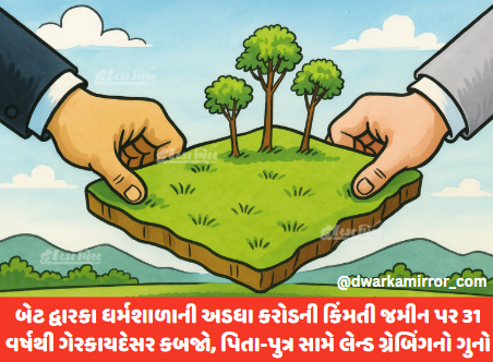 દેવભૂમિ દ્વારકા જિલ્લાના ઓખા મંડળના બેટ દ્વારકા વિસ્તારમાં ધર્મશાળાની કિંમતી જમીન પર ગેરકાયદે કબજાની ગંભીર ઘટના સામે આવી છે. લગભગ ત્રણ દાયકાથી ધર્મશાળાની જમીન પર કબજો જમાવી રાખવાના મામલે આરંભડા વિસ્તારમાં રહેતા પિતા-પુત્ર વિરુદ્ધ લેન્ડ ગ્રેબિંગના કાયદા હેઠળ ગુનો નોંધવામાં આવ્યો છે.