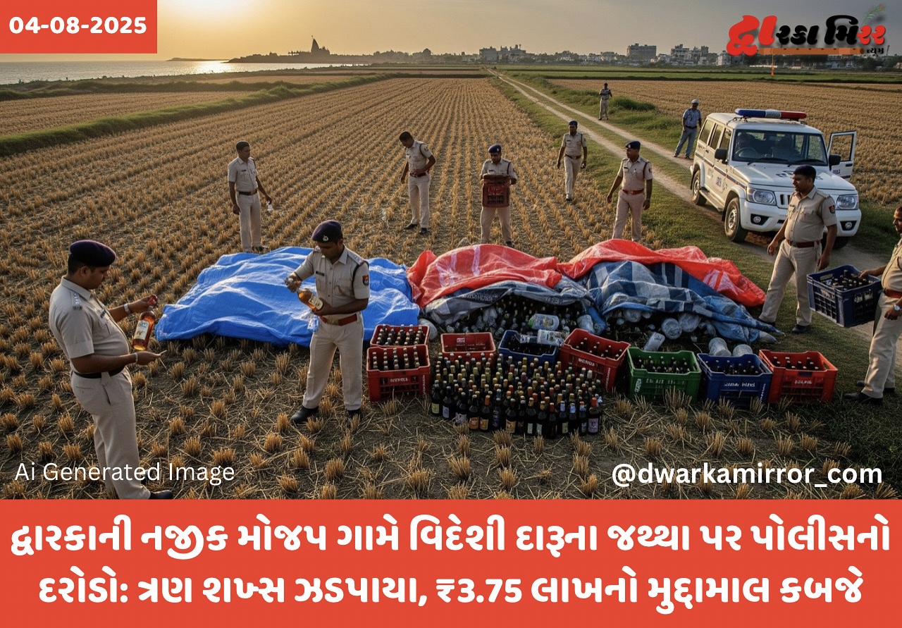 દ્વારકા નજીકના મોજપ ગામે નાયબ પોલીસ અધિક્ષકની ટીમે રવિવારે સાંજે મોટો દરોડો કરી વિદેશી દારૂનો જથ્થો ઝડપી પાડ્યો હતો. આ દરોડામાં ત્રણ શખ્સોની અટકાયત કરવામાં આવી છે અને પોલીસએ ₹3,75,400 ની કિંમતનો મુદ્દામાલ જપ્ત કર્યો છે.