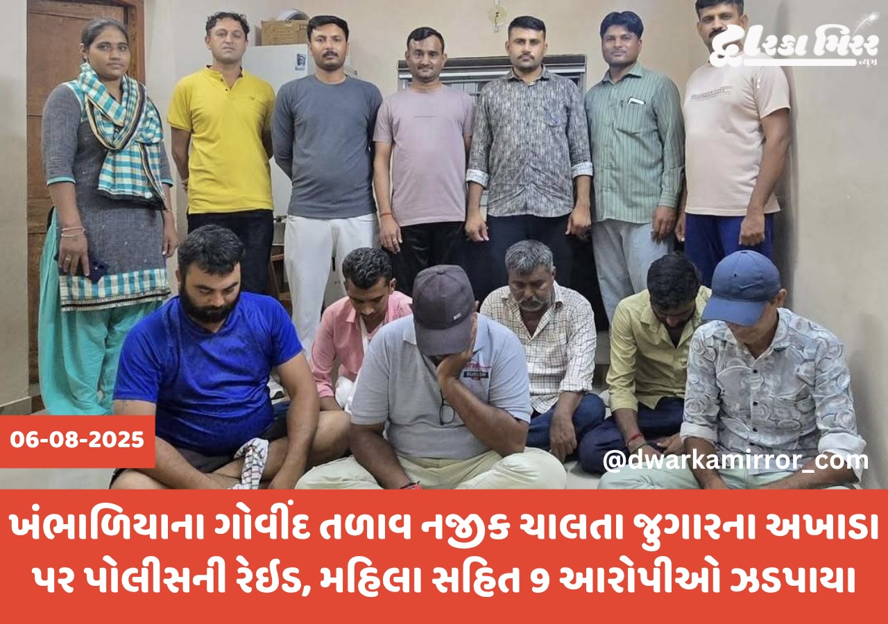 દેવભૂમિ દ્વારકા જિલ્લાના ખંભાળિયા પો.સ્ટે. વિસ્તારમાં ગોવિંદ તળાવ પાસે ભગવતી હોલની પાછળ આવેલ રહેણાક મકાનમાં જુગારના અખાડા અંગે ચોક્કસ માહિતીના આધારે ખંભાળિયા પોલીસ દ્વારા રેઇડ હાથ ધરવામાં આવી હતી. રેઇડ દરમિયાન કુલ ૯ આરોપીઓને જુગાર રમતા રંગે હાથે ઝડપી લેવામાં આવ્યા હતા અને તેમની પાસેથી કુલ ₹17,540 ની રોકડ રકમ તથા ગંજીપતાના ૫૨ પાનાનું દાવપેચ સાધન જપ્ત કરવામાં આવ્યું હતું.
