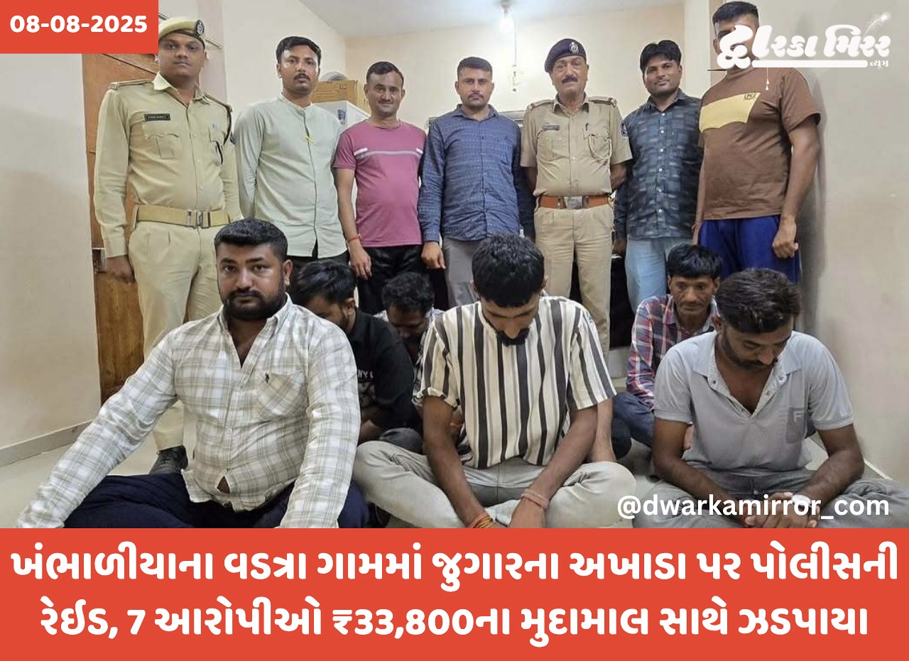 ખંભાળીયા તાલુકાના વડત્રા ગામની દક્ષિણ તરફ, જાપા વાળા તળાવની બાજુમાં આવેલ સાજણભાઇ આલાભાઇ ચાવડાના કબ્જાની વાડીએ રહેણાક મકાનમાં ચાલી રહેલા જુગારના અખાડા પર ખંભાળીયા પોલીસ દ્વારા નાઇટ રાઉન્ડ પેટ્રોલિંગ દરમ્યાન ચોક્કસ માહિતીના આધારે રેઇડ હાથ ધરવામાં આવી. આ કાર્યવાહીમાં કુલ ૦૭ આરોપીઓને જુગાર રમતા રંગે હાથે ઝડપીને ₹૩૩,૮૦૦ રોકડ રકમ તથા ગંજીપતાના ૫૨ પાના કબજે કરવામાં આવ્યા.