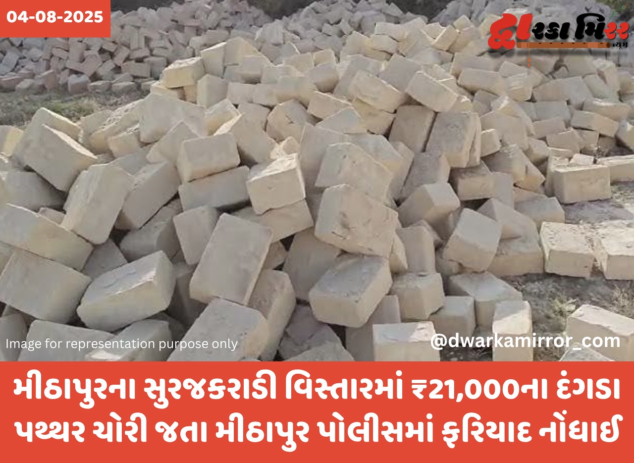 મીઠાપુર તાલુકાના સુરજકરાડી વિસ્તારમાં દંગડા પથ્થર ચોરી થયાની ઘટનાને લઈને સ્થાનિકોમાં ચકચાર ફેલાઈ છે. પ્રાપ્ત માહિતી મુજબ, ઓખા મંડળના મીઠાપુર તાબેના સુરજકરાડી વિસ્તારમાં રહેતા માસૂરભાઈ વિરમભાઈ હાથીયા નામના 31 વર્ષના યુવાને મીઠાપુર પોલીસ મથકે ફરિયાદ નોંધાવી છે.